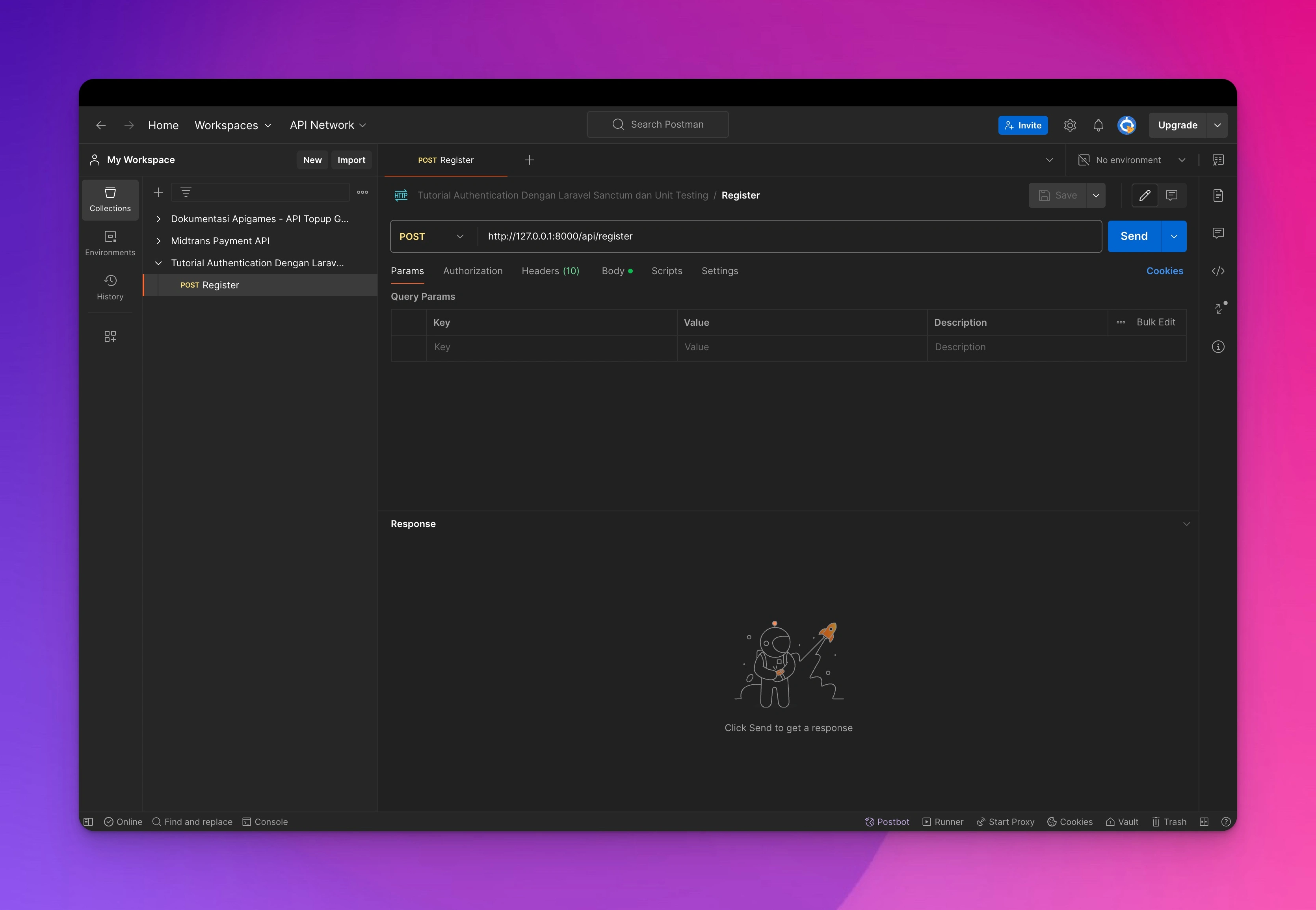 Setelah berhasil membuat test dan menjalankannya, disini kita akan lanjutkan melakukan uji coba rest api tersebut menggunakan Postman. Silahkan teman - teman buka aplikasi Postman, kemudian masukan url http://localhost:8000/api/register dan method-nya silahkan di set menjadi POST.